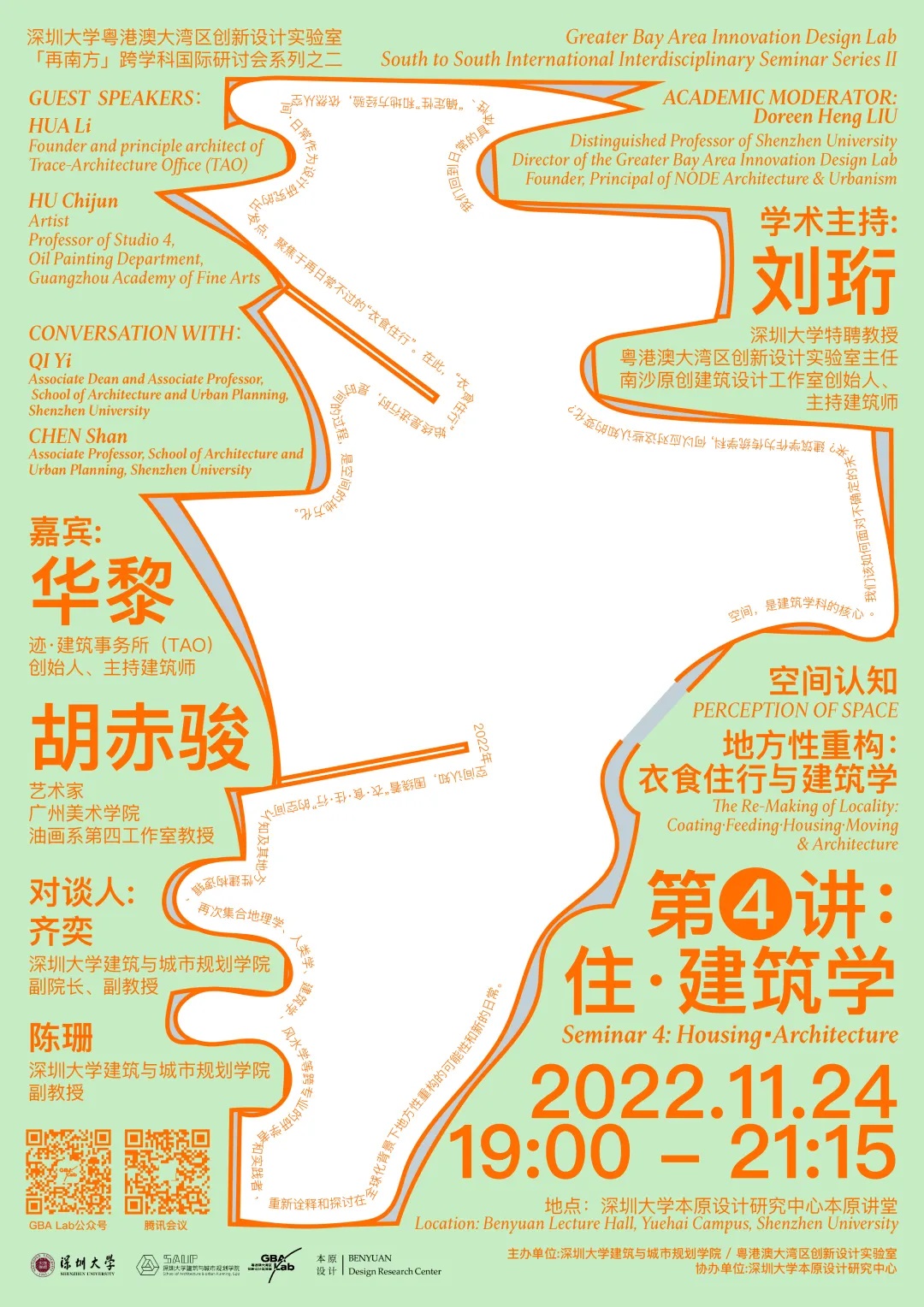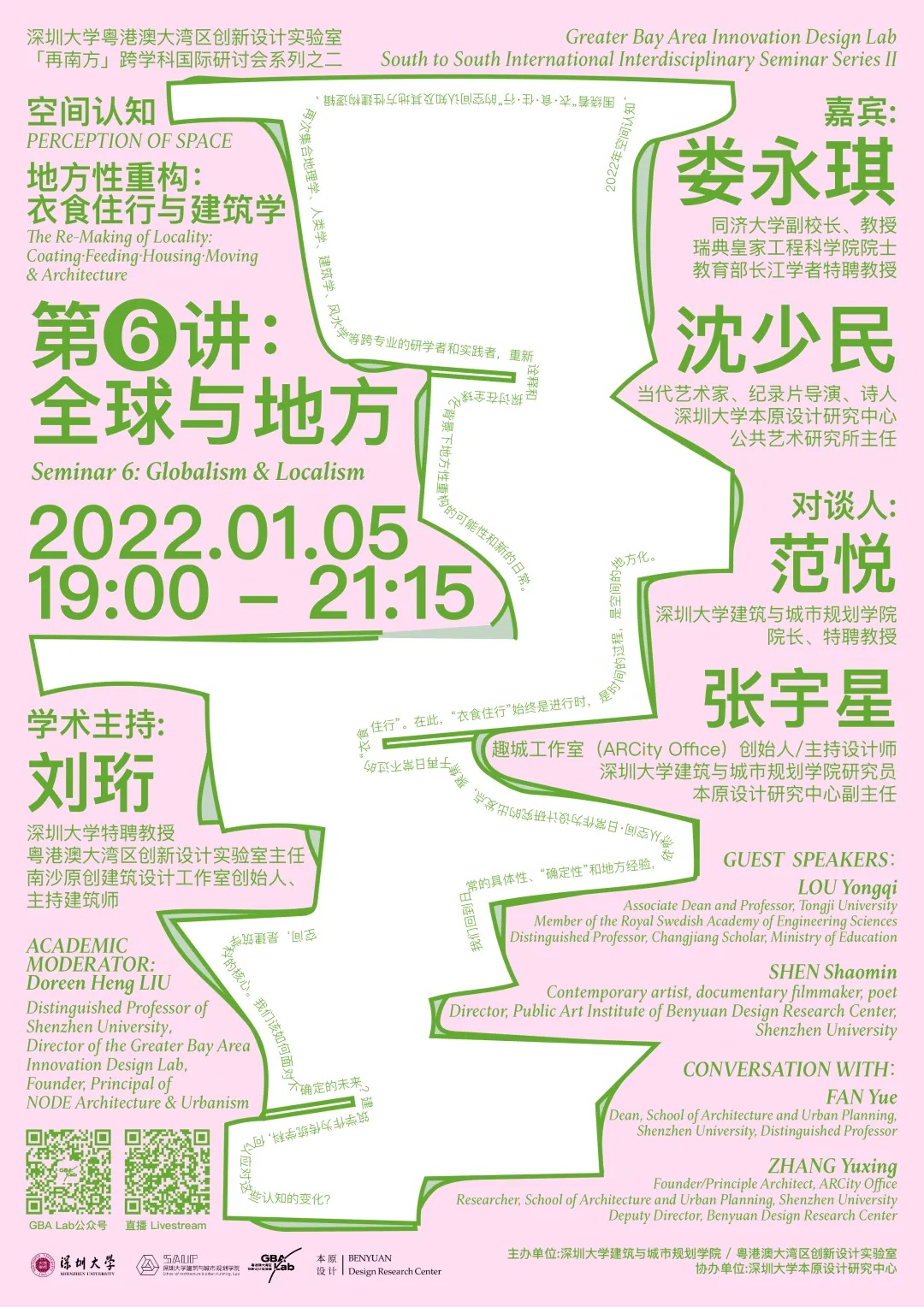 ⭘ The Perception of Space Forum/Innovation Course for Fall Semester 2022, among the South to South International Interdisciplinary Seminar Series launched by the Greater Bay Area Innovation Design Lab, Shenzhen University, comprises six sessions revolving around "The Re-Making of Locality: Clothing, Food, Housing, Transportation & Architecture".