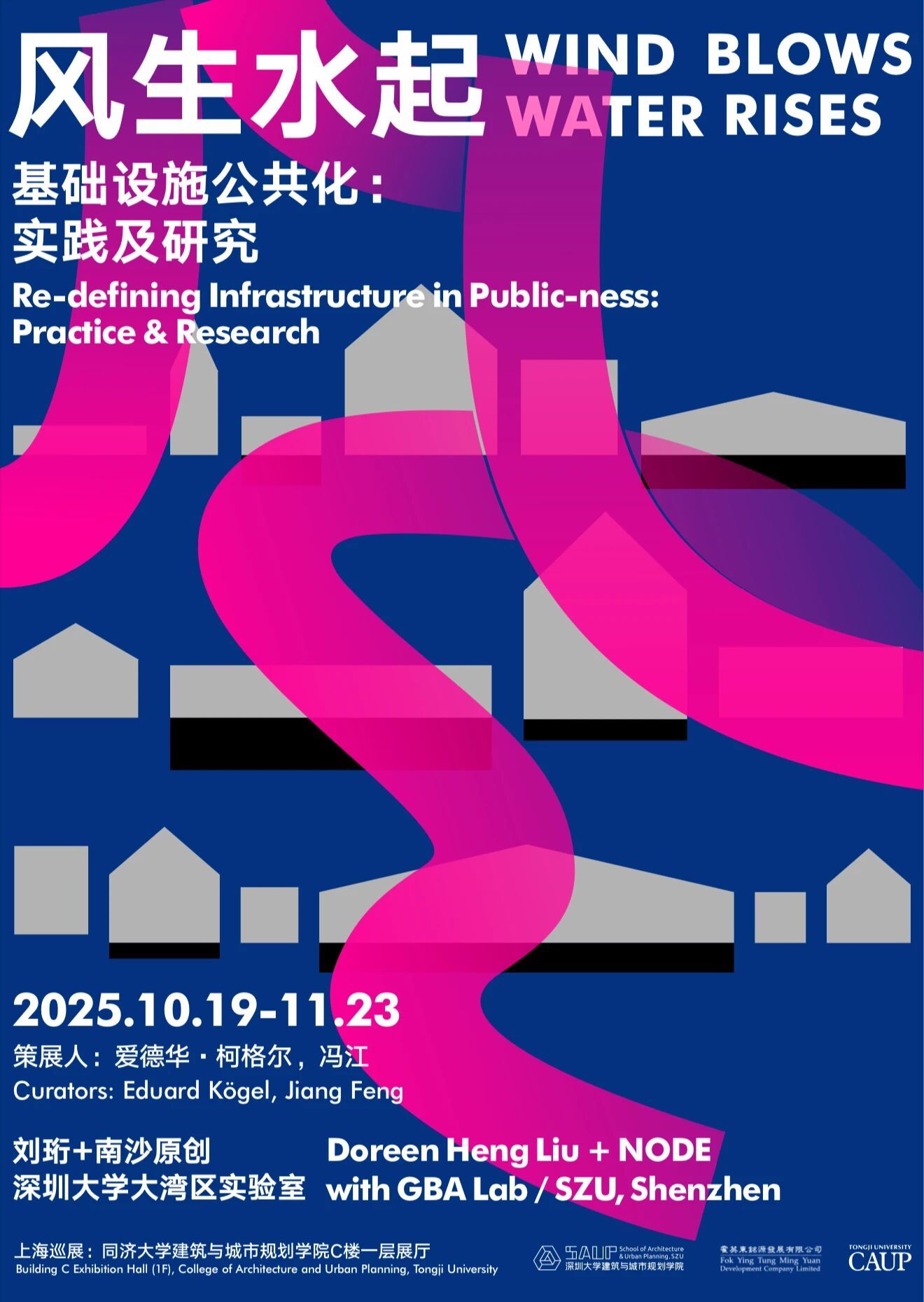 ○On October 19, 2025, the exhibition WIND BLOWS, WATER RISES:Re-defining Infrastructure in Public-ness: Practice & Research will open at the School of Architecture and Urban Planning, Tongji University. As the first domestic stop, this exhibition continues from the inaugural show at Aedes in Berlin in February 2025 and serves as a summary of the research outcomes from NODE Architecture & Urbanism and the GBA Lab at Shenzhen University. The exhibition integrates practice displays, academic discussions, and a grand unveiling, creating a platform for dialogue between infrastructure in the Yangtze River Delta and the Pearl River Delta.
