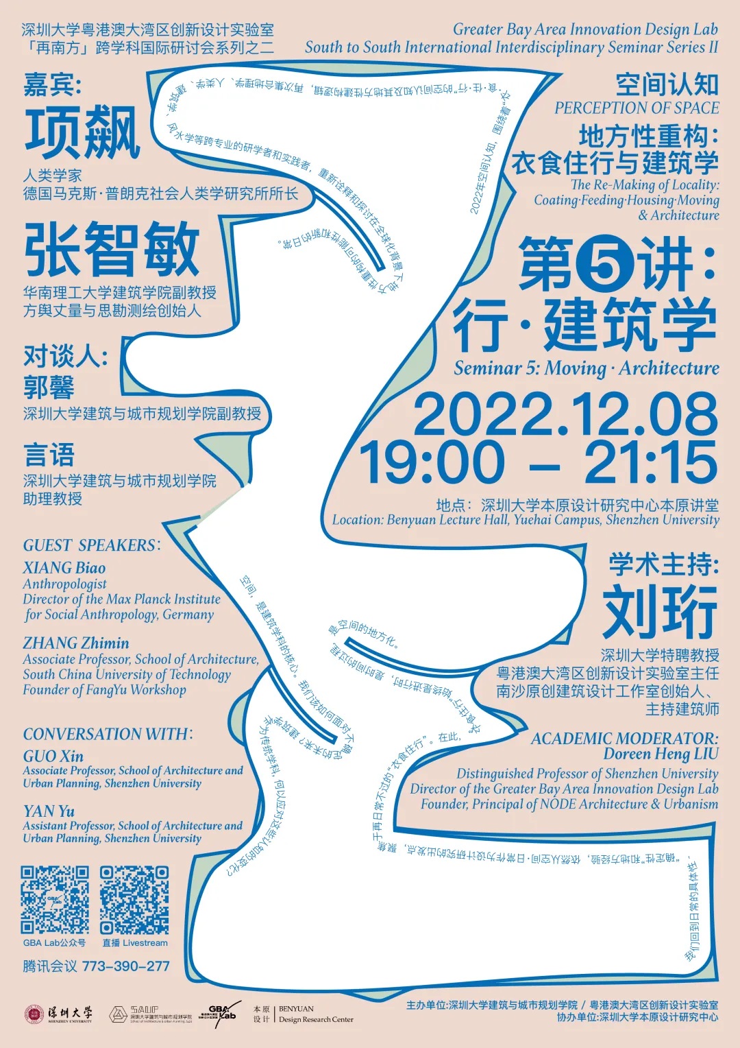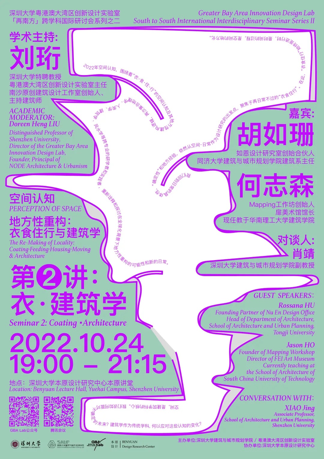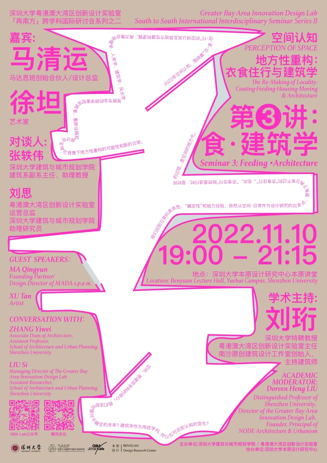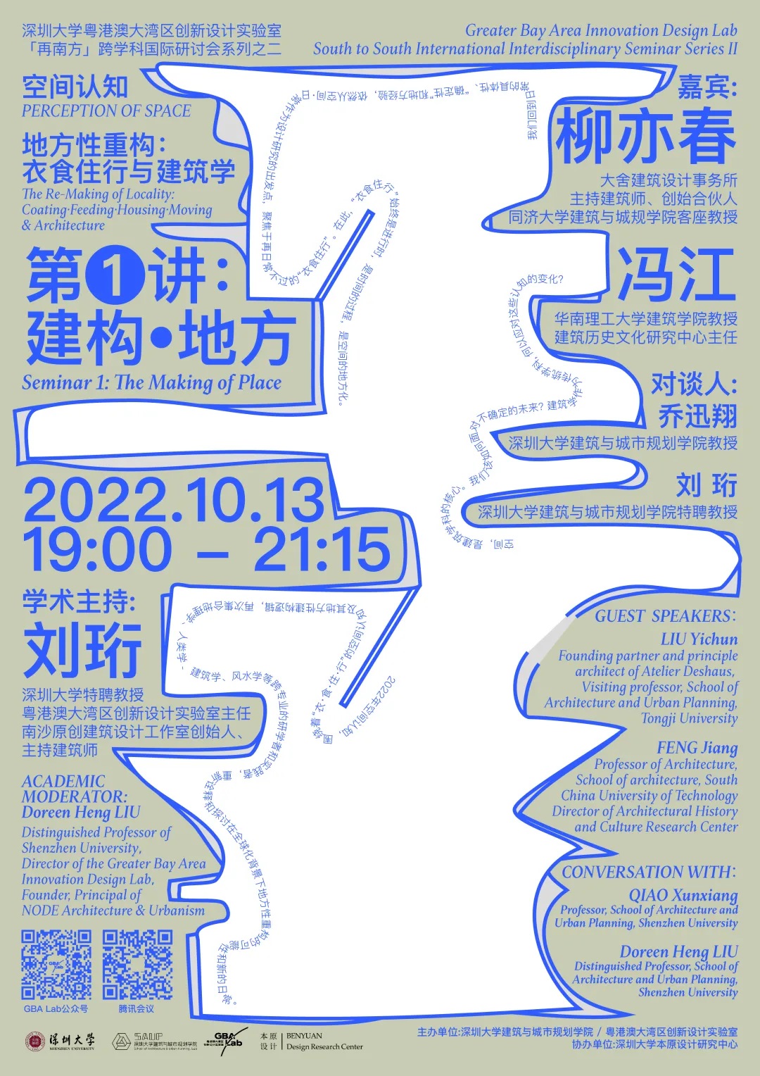 ⭘ The Perception of Space Forum/Innovation Course for Fall Semester 2022, among the South to South International Interdisciplinary Seminar Series launched by the Greater Bay Area Innovation Design Lab, Shenzhen University, comprises six sessions revolving around "The Re-Making of Locality: Clothing, Food, Housing, Transportation & Architecture".