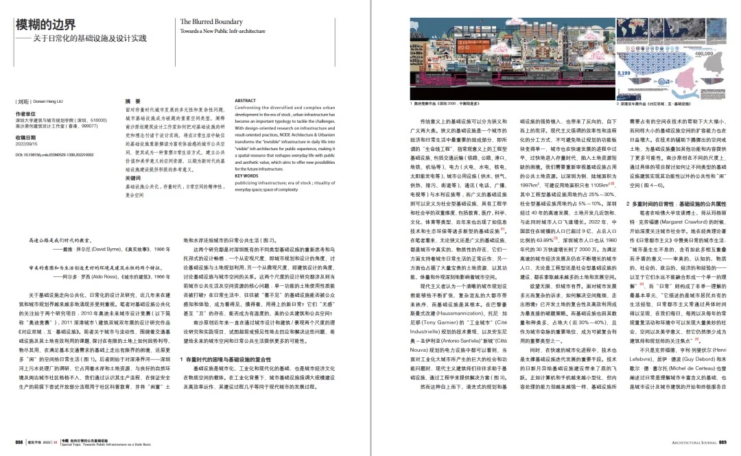 Confronting the diversified and complex urban development in the era of stock, urban infrastructure has become an important typology to tackle the challenges. With design-oriented research on infrastructure and result-oriented practices, NODE Architecture & Urbanism transforms the "invisible" infrastructure in daily life into "visible" infr-architecture for public experience, making it a spatial resource that reshapes everyday life with public and aesthetic value, which aims to offer new possibilities for the future infrastructure.