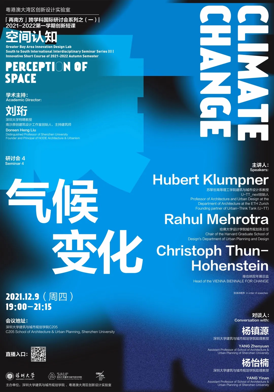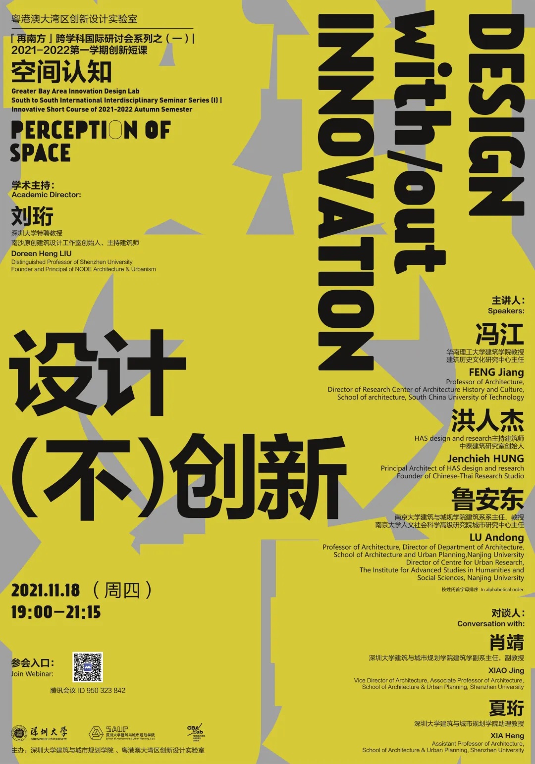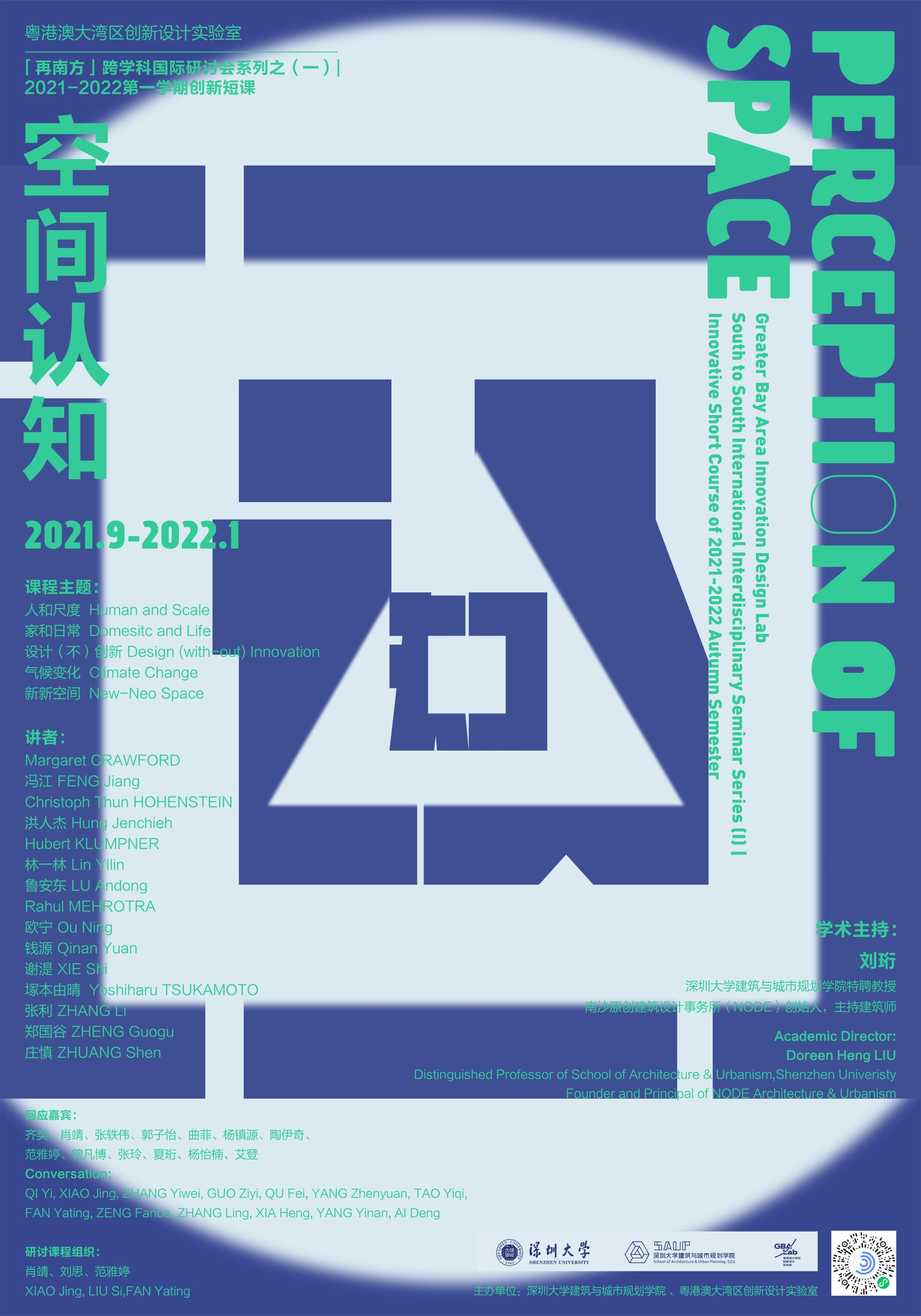 ○ 「再南方」系列研讨会2021年秋季学期的主题为“空间认知”,共设六讲,包括五讲研讨会和一讲汇报总结。五讲研讨会基于“不确定性”和“改变”,分别围绕五个主题:人·尺度、家·日常、设计(不)创新、气候变化和新新空间,从研究和实践两个维度展开。研讨会由刘珩教授策划并主持,邀请国际国内的建筑师和学者,与艺术家、社会学家、人类学家和地理学家展开跨界跨学科对话,将艺术、美育、人文纳入建筑学的探讨,探讨建筑学未来面临的问题。
