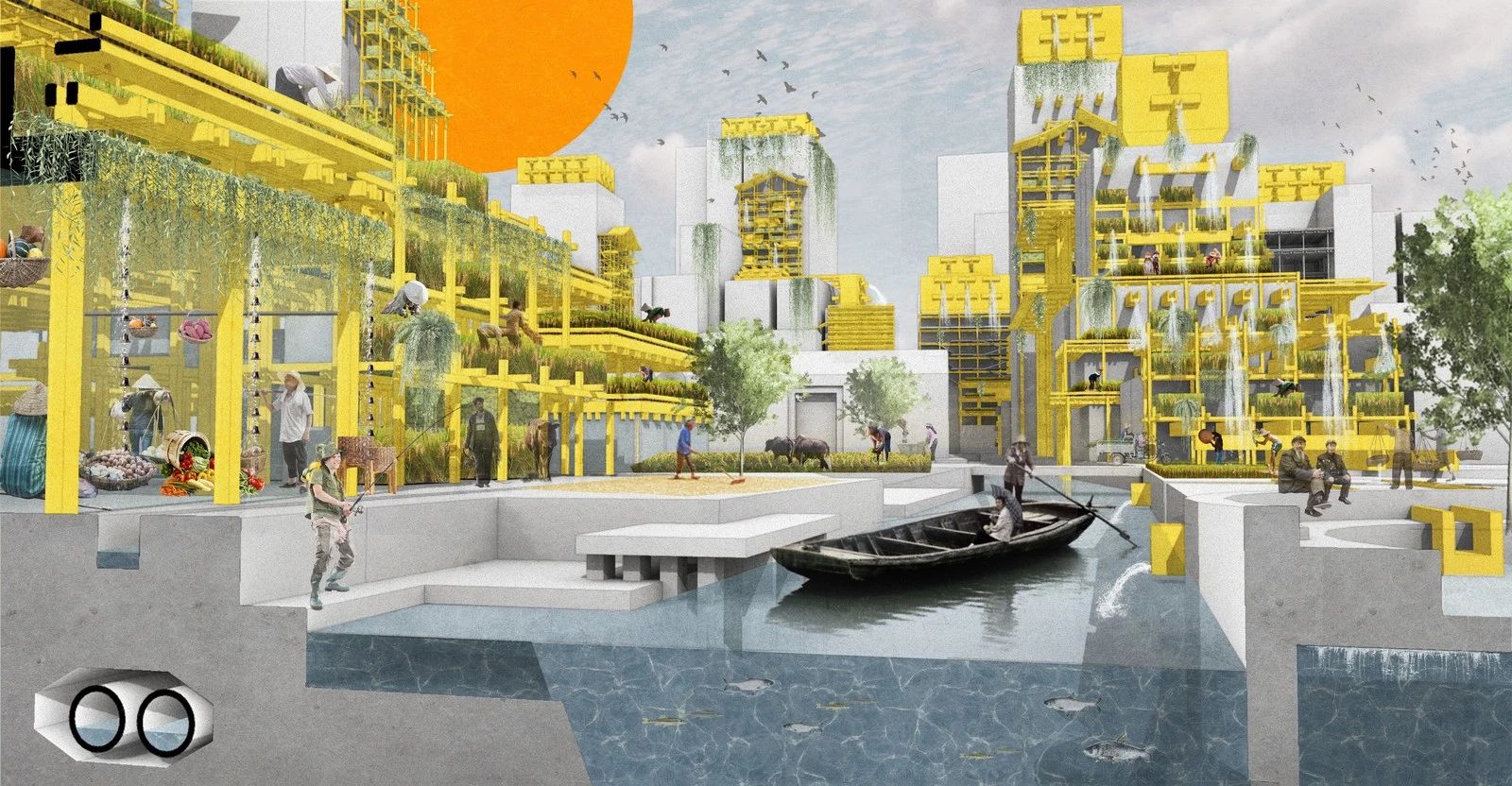 设计利用立体灌溉和雨水收集等技术,在城中村有限的空间内最大化地利用水资源,根据过去的水田分布脉络,将城市雨水引入古村,解决水患问题的同时复现过去的日常生活和文化活动,唤醒人们对于当地传统的记忆。
